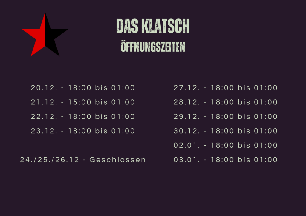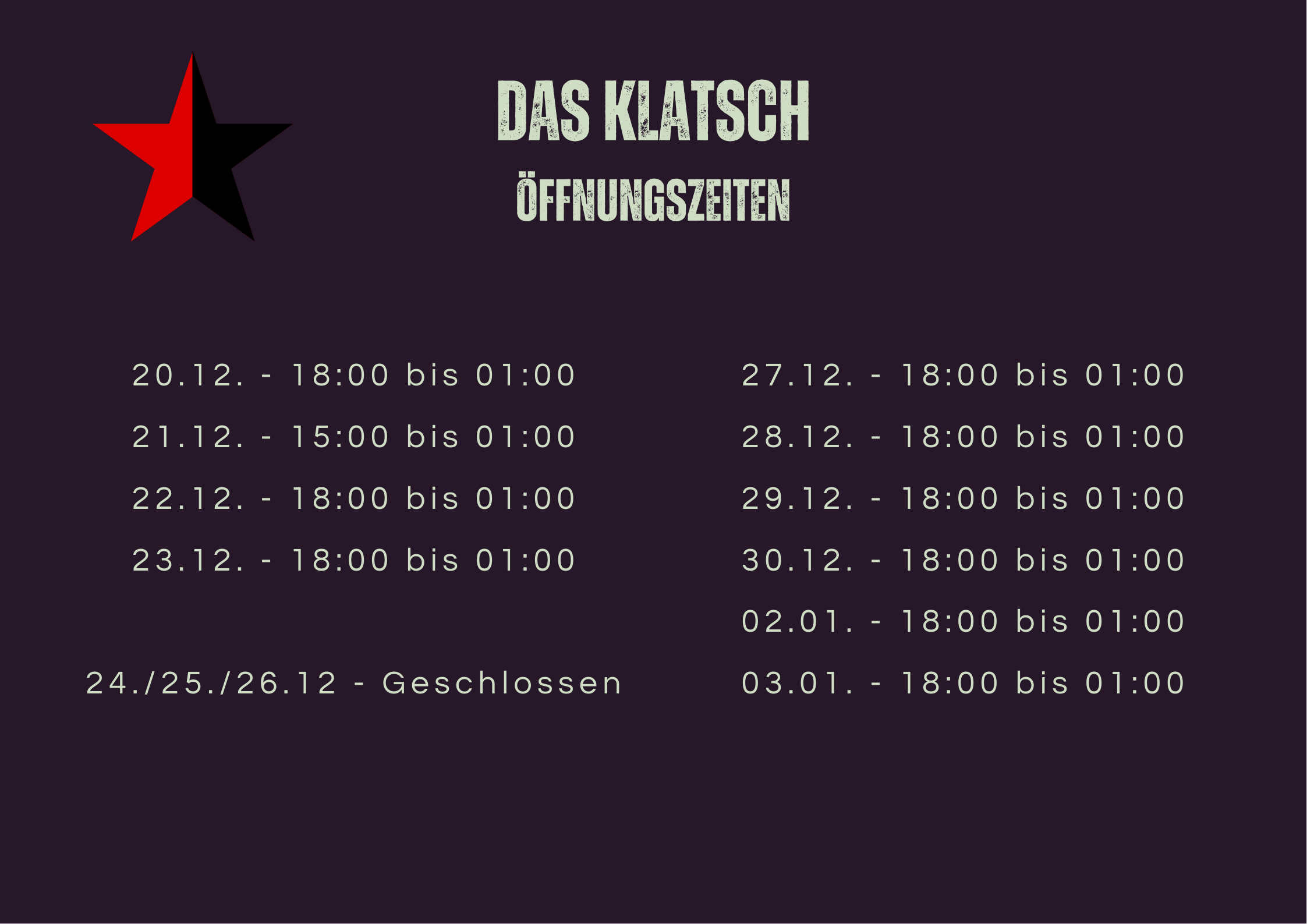 Wir machen endlich wieder auf! 🚀🍾🎉 Am 20.12.25 ab 18 Uhr laden wir alle ins Klatsch ein und feiern das Ende der Renovierung, das neue Konzept, die großartige Hilfe von vielen, alles, was wir vermisst haben und uns selbst sowieso. Wir haben zwischen den Jahren dann erstmal an diesen Tagen geöffnet: 20./21./22./23.12, dann geschlossen am 24./25. und wieder auf am 26./27./28./29./30.12. Neustart! Wir freuen uns so sehr drauf! Wir sehen uns im Klatsch!