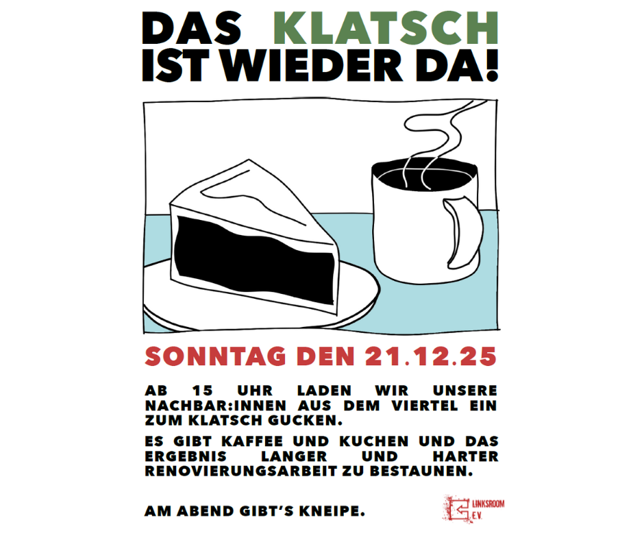 Nach der Einweihungsfete am Samstag öffnen wir am Sonntag, den 21.12. um 15 Uhr mit einem Nachbarschaftscafé! Bis 18 Uhr gibt es Zeit sich zu informieren, ins Gespräch zu kommen, sich wiederzusehen. Wir freuen uns sehr, dass wir dort und überhaupt zwischen den Jahren tatkräftige Unterstützung von unserem zukünftigen Mieter, der Klatsch Genossenschaft bekommen, denn danach geht´s nahtlos weiter mit einem wilden Kneipenabend. Wir haben gemeinsam renoviert, geschuftet, geträumt, geschwitzt, also folgt denen schonmal. Und kommt vorbei auf Kaffee und Kuchen beim Nachbarschaftscafé nächsten Sonntag!